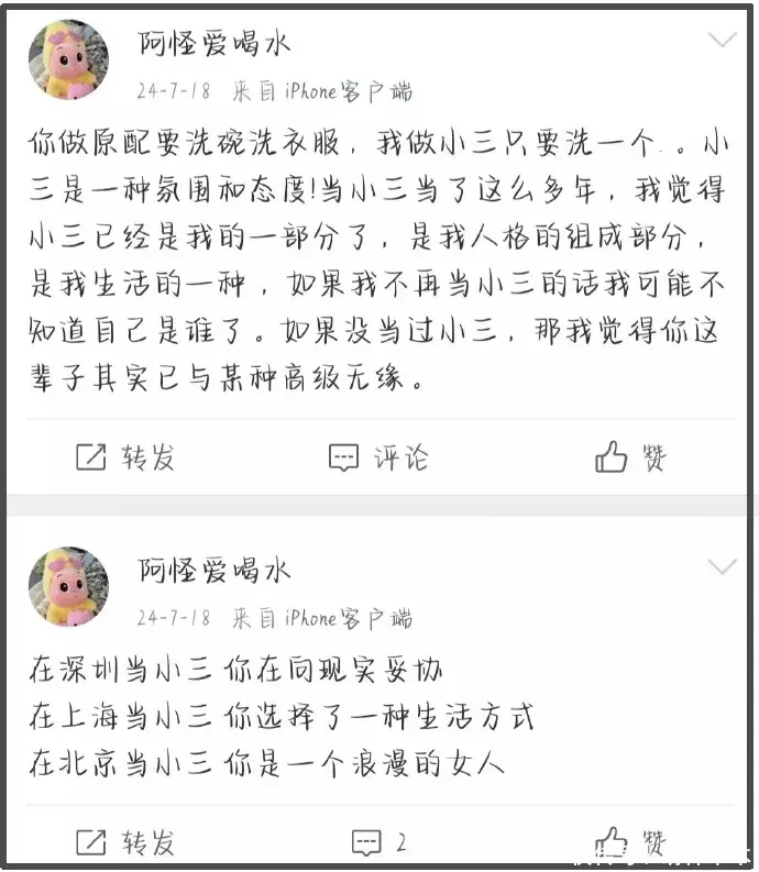 除了以上的法律问题外,白珊珊的博文还暴露了道德底线,她自称当了小三多年,宣扬小三出轨等概念,完全无视伦理道德。而且,对国家的自信心也不够,还觉得“外国的月亮比较圆”。