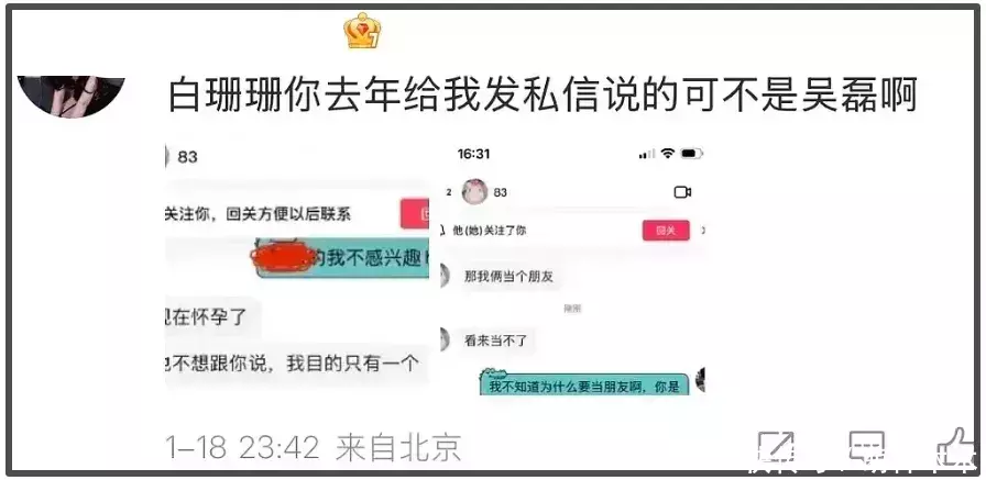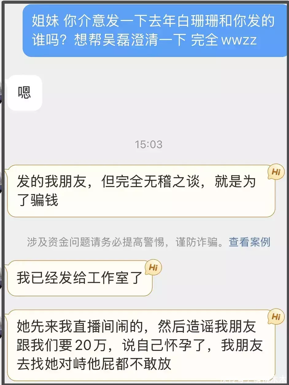 另外,有其他网友自称有同款受害者经历,表示白珊珊去年使用同一个套路骗了她朋友,一开始跑到他们直播间拿自己怀孕信息勒索要价20万,对方坚决对质结果白珊珊怂了,啥也不敢说。据该网友称,她已经把相关证据发给吴磊工作室了,若假爆料属实,证据又加一。