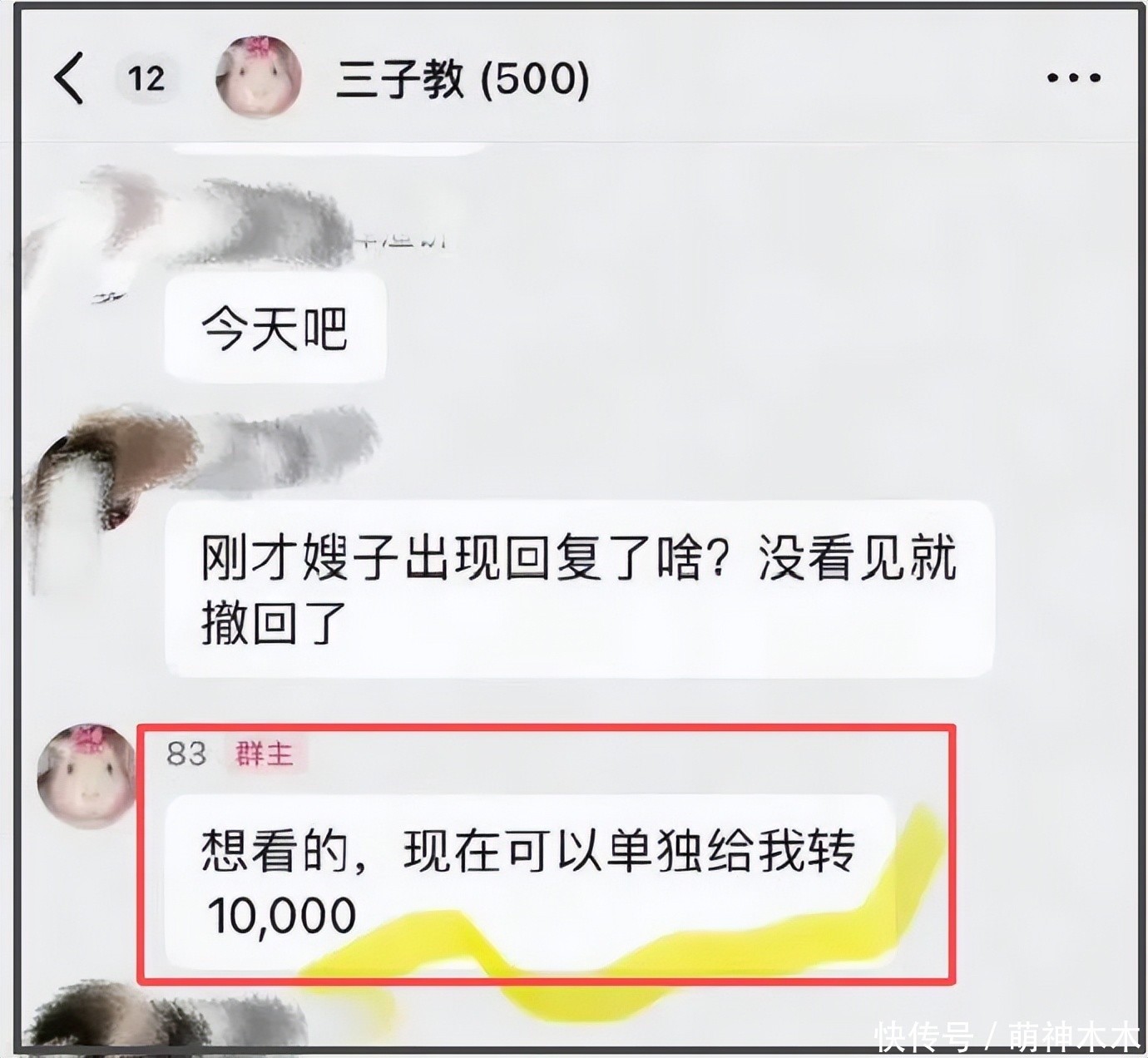 在文字爆料吴磊瓜后,珊珊发了聊天群预告会放照片锤,到点后她本人并没有履行承诺,还在群内自称想看给的她打款一万,被质疑是“诈骗”套路,事实是她后续也并没有发布照片等证据。