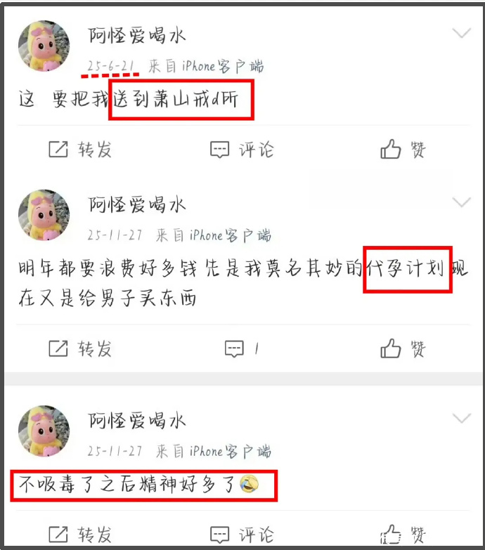 关于吸毒这块,还有网友表示她有强调不是在境内发生的,国内管不了,还说过吸毒占了她花销大头等内容,怎么看都不太正常。此外,她提出的代孕计划也是违法行为, 从她漫不经心的口吻中能看出毫无法律意识。