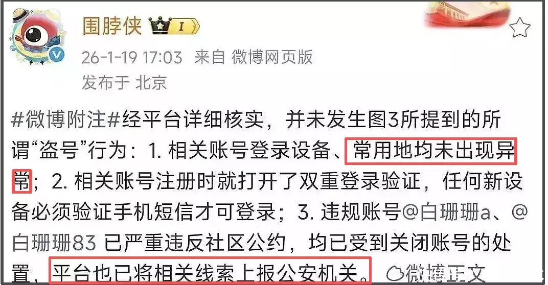 据微博核实,白珊珊账号登录设备、常用地并未出现异常登录情况,且账号设置了双重登录验证,任何设备登录都需要短信验证码,目前已将“白珊珊”相关违规账号关闭,并把相关线索上报给公安机关调查。从微博的措辞来看,条理清晰,唯恐卷入争议。